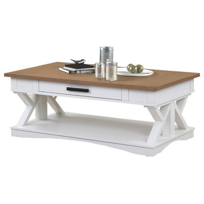 Create an accountThis coffee table brings extra storage and a coastal farmhouse look to your living room. The frame is made from solid and engineered wood with a rustic, weathered finish, and it's built on a wide base with open geometric accents on the legs. This table showcases a 48" long surface that accommodates a stack of books or a set of coasters. A single drawer and an open shelf on the bottom provide additional space for remotes, baskets, and reading glasses. But the best part? This coffee table is built on caster wheels for easy mobility.