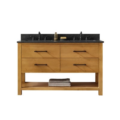 Create an accountThis modern vanity with clean lines and bold proportions brings a minimal aesthetic to the bathroom. Features a soft-close solid wood dovetail drawer, flip-down tray, and an open shelf design for added storage. Built with solid wood and wood veneer and available in color featuring a high-quality Blue Limestone natural top with a ceramic undermount sink and is paired with matte black hardware. Also available in 30", 36", 42" and 54". Note: The lighting conditions might affect the color.